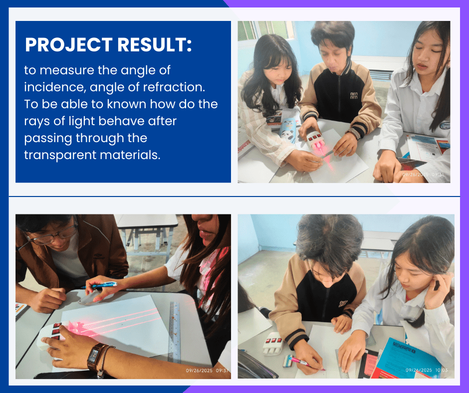 Result or output of the project:to measure the angle of incidence ,angle of refraction. To be able to known how do the rays of light behave after passing through the transparent materials.